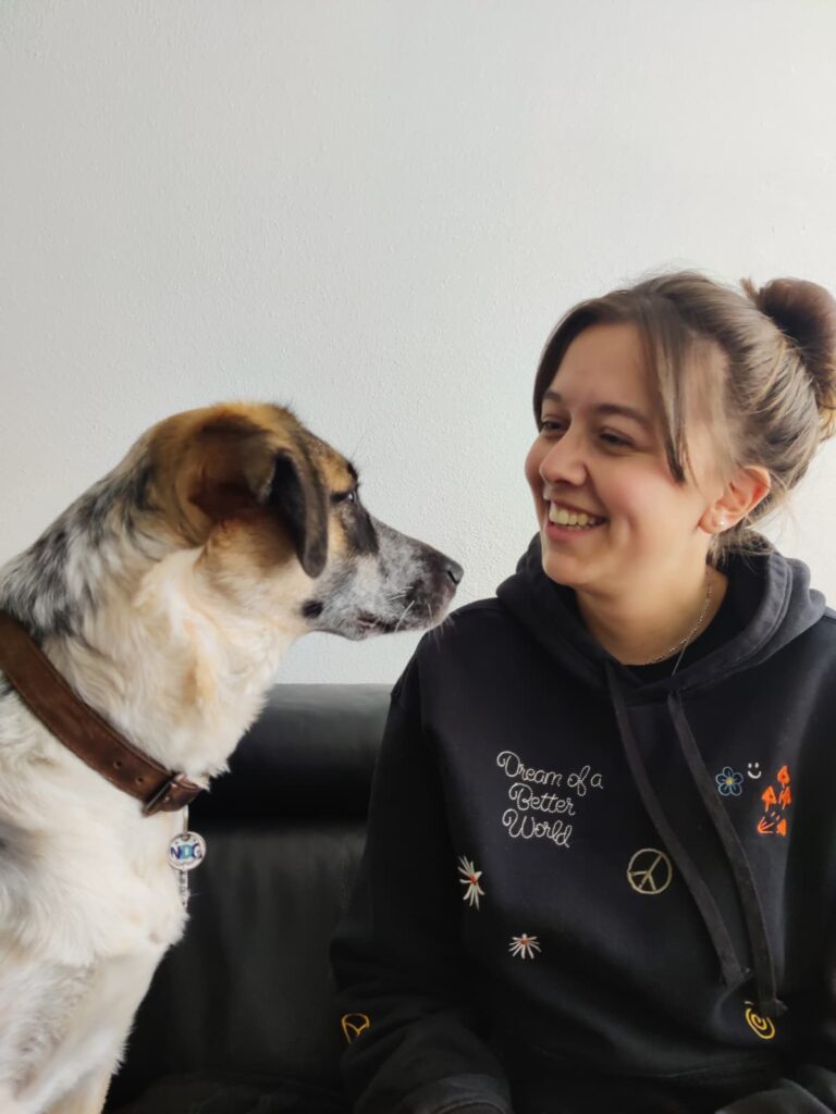 Mijn liefde voor honden begon al vroeg: toen ik twee jaar oud was, kwam Nina, een vrolijke Boomer, ons gezin versterken. Zij is een aantal jaar geleden helaas overleden, maar heeft een blijvende indruk op me achtergelaten. Inmiddels heb ik mijn eerste eigen hond, Jolly (Bean) — een jonge, enthousiaste hond die samen met haar nestje op straat werd gevonden in Italië.